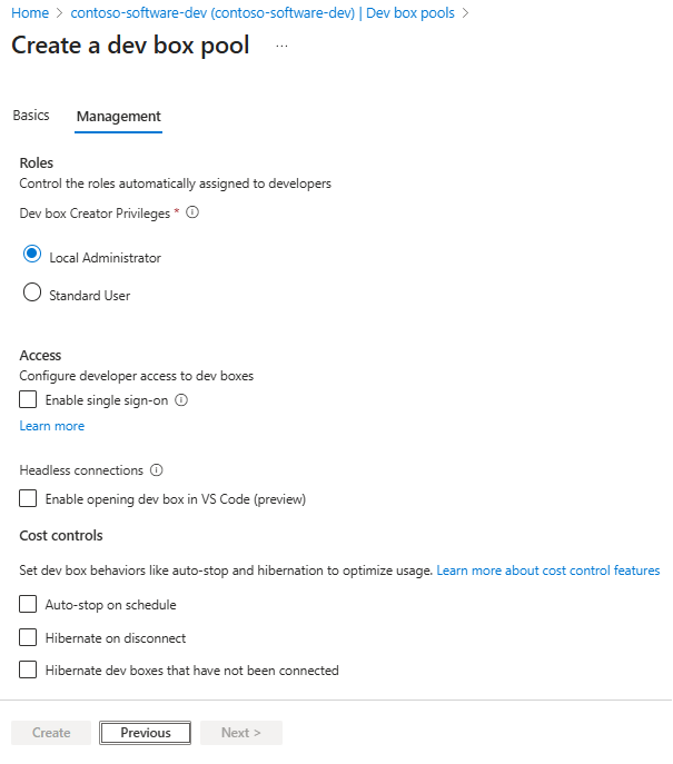 設定 価値 役割 Dev box Creator Privileges (開発ボックス作成者の特権) [ローカル管理者] または [標準ユーザー] を選択します。 Access シングル サインオン (SSO) を有効にする ユーザーが組織の資格情報を使用して開発ボックスにサインインできるようにする場合に選択します。 ヘッドレス接続 開発者が完全なデスクトップ エクスペリエンスなしで Visual Studio Code で開発ボックスを開くために選択します。 コスト管理 スケジュールに従って自動停止する 自動ストップ スケジュールを有効にするには、チェック ボックスをオンにします。 プールの作成後に自動ストップ スケジュールを構成することもできます。 停止時刻 プール内のすべての開発ボックスをシャットダウンする時刻を選びます。 休止状態をサポートする開発ボックスは、指定された時刻に休止状態になります。 休止状態をサポートしていない開発ボックスはシャットダウンします。 タイム ゾーン 停止時間のタイム ゾーンを選びます。 切断時の休止状態 指定された猶予期間の後に誰も接続されていない開発ボックスを休止状態にします。 猶予期間 指定された猶予期間の後に接続されていない開発ボックスを休止状態にします。 [作成] を選択します