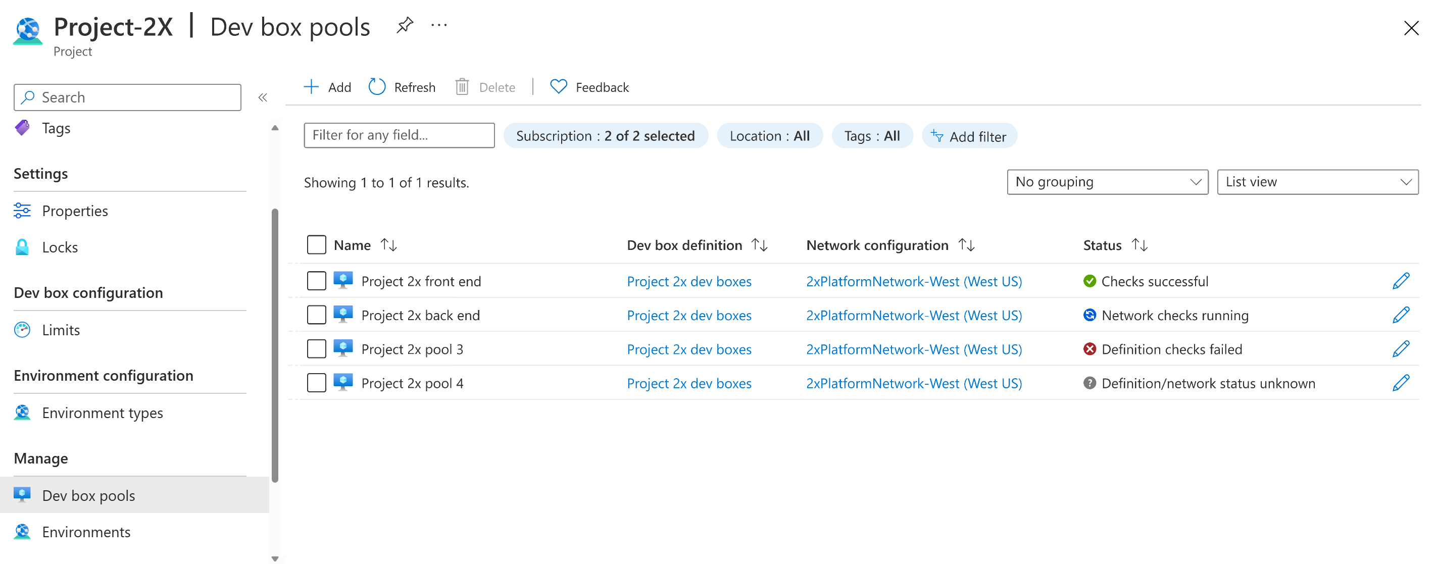 Azure portal は開発ボックス プールをデプロイし、正常性チェックを実行して、イメージとネットワークが開発ボックスの検証基準を満たしていることを確認します。 次のスクリーンショットの 4 つの開発ボックス プールは、それぞれ状態が異なっています。