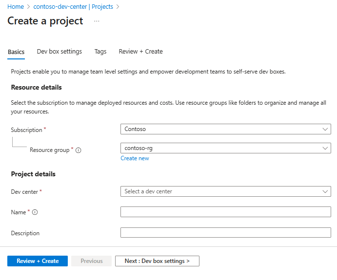 開発ボックス プロジェクトを使用すると、チーム レベルの設定を管理できます。 これらの設定には、開発者が開発ボックスを作成できるように、開発チームへのアクセス権の付与が含まれます。 各デベロッパー センターには、少なくとも 1 つのプロジェクトが必要です。
