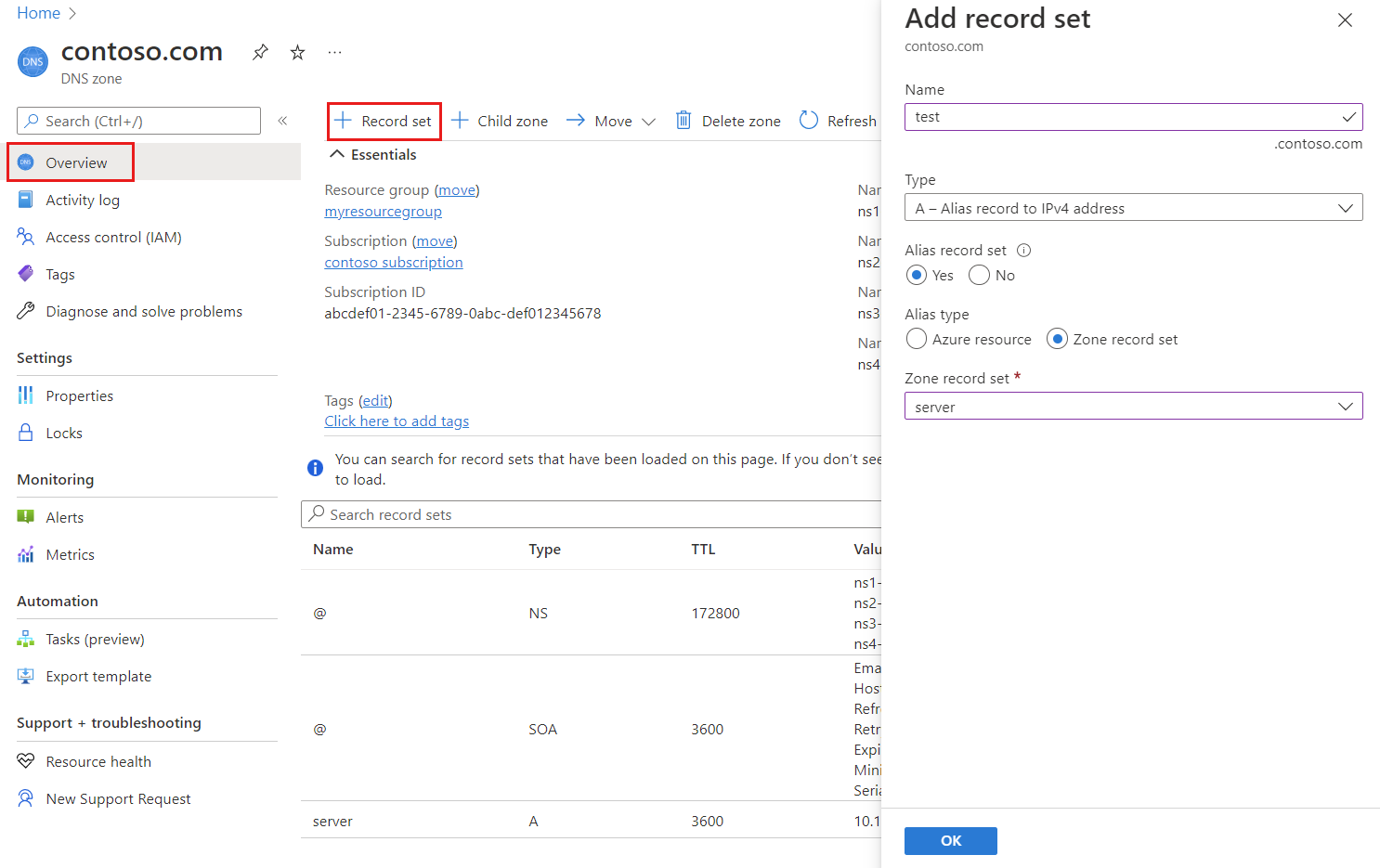 contoso.com DNS ゾーンの [概要] ページで、[+ レコード セット] ボタンを選択します。