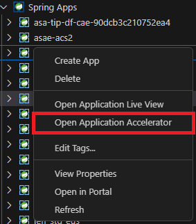 VS Code の Azure Spring Apps Enterprise プラン サービス インスタンスでアプリ アクセラレータの任意のアクセラレータからプロジェクトを直接ブートストラップできます。