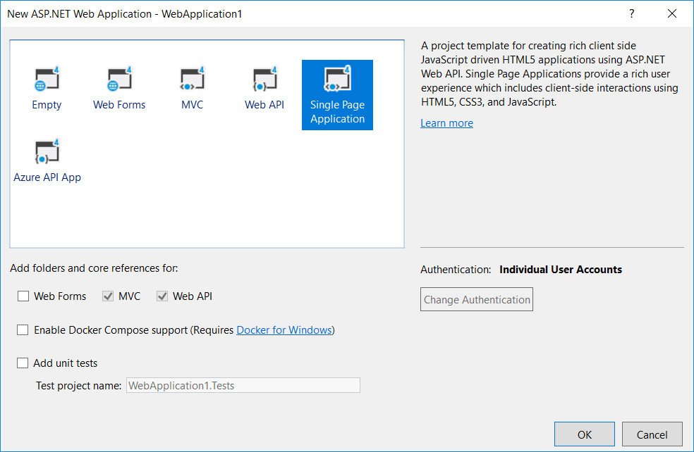 Visual Studio 2017 および ASP.NET 4.7.2 では、シングル ページ アプリケーション (SPA) および Web API サービスのセキュリティ オプションが拡張され、外部認証サービスと統合されます。これには、Microsoft アカウント、Twitter、Facebook、Google など、いくつかの OAuth/OpenID およびソーシャル メディア認証サービスが含まれます。