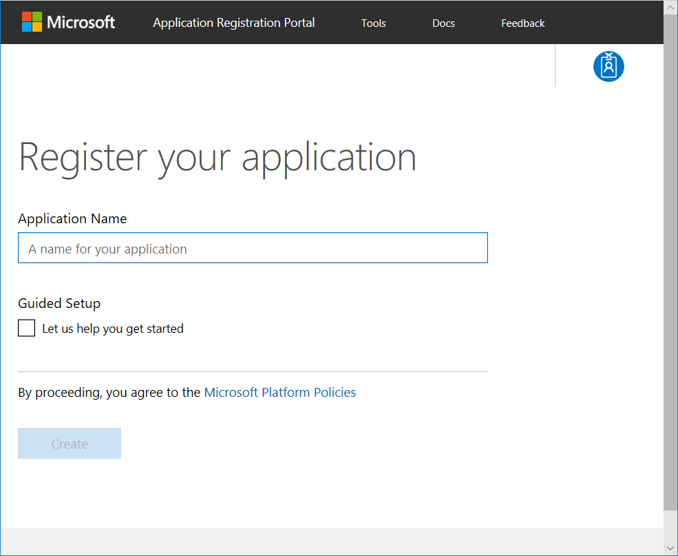 [アプリを追加する] を選択し、メッセージが表示されたらアプリケーションの名前を入力し、[作成] をクリックします。