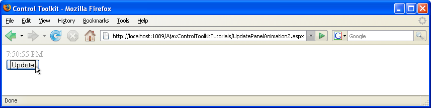 最後に、 UpdatePanelAnimationExtender を構成する必要があります。 TargetControlID 属性をパネルの ID に設定し、エクステンダー内でアニメーションを定義します。 フェードインは意味があり、更新された時間を視覚的に強調します。 エクステンダー マークアップは次のようになります。