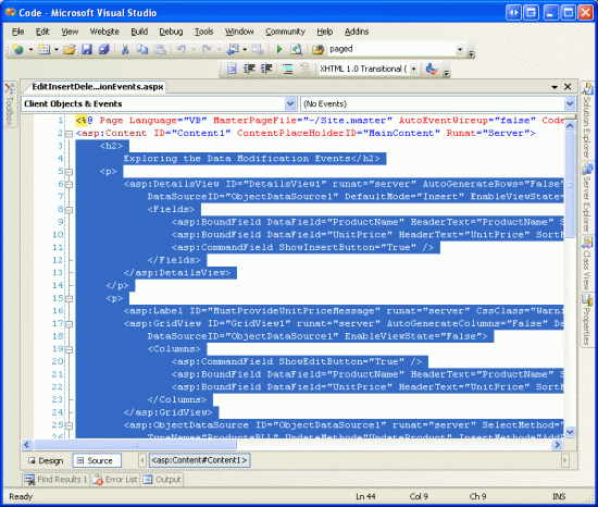 DataModificationEvents.aspxページを開きます。 - そのページの宣言マークアップに移動します (ページの下部にある [ソース] ボタンをクリックします)