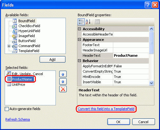 [フィールド] ダイアログ ボックスを使って BoundField を TemplateField に変換すると、BoundField 自体と同一の、読み取り専用の編集および挿入インターフェイスを表示する TemplateField が生成されます。 次のマークアップは、TemplateField に変換された後の DetailsView での ProductName フィールドの宣言構文を示しています: