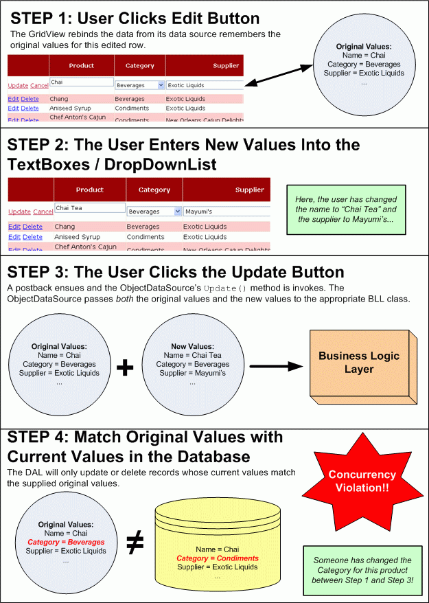 オプティミスティック コンカレンシー制御は、更新または削除されるレコードの値が、更新または削除プロセスの開始時と同じであることを確認することによって機能します。 たとえば、編集可能な GridView で [編集] ボタンをクリックすると、レコードの値がデータベースから読み取られ、TextBoxes やその他の Web コントロールに表示されます。 これらの元の値は GridView によって保存されます。 その後、ユーザーが変更を加えて [更新] ボタンをクリックすると、元の値と新しい値がビジネス ロジック レイヤーに送信され、次にデータ アクセス層に送信されます。 データ アクセス層は、ユーザーが編集を開始した元の値がデータベース内の値と同じ場合にのみレコードを更新する SQL ステートメントを発行する必要があります。 図 2 は、この一連のイベントを示しています。