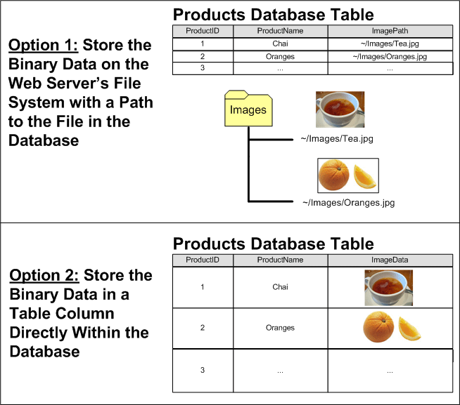 Northwind データベースを拡張して、写真を各製品に関連付ける必要があるとします。 1 つのオプションは、Web サーバーのファイル システムにこれらの画像ファイルを保存し、Products テーブルにパスを記録することです。 この方法では、おそらく、ImagePath 型の Products テーブルに varchar(200) 列を追加します。 ユーザーがチャイの写真をアップロードすると、その写真は Web サーバーのファイル システム (~/Images/Tea.jpg) に保存される可能性があります。ここで、~ はアプリケーションの物理パスを表します。 つまり、Web サイトが物理パス C:\Websites\Northwind\ でルート化されている場合、~/Images/Tea.jpg は C:\Websites\Northwind\Images\Tea.jpg と同等になります。 画像ファイルをアップロードした後、Products テーブルのチャイ レコードを更新して、ImagePath 列で新しい画像のパスが参照されるようにします。 すべての製品画像をアプリケーションの ~/Images/Tea.jpg フォルダーに配置することにした場合、Tea.jpg または単に Images を使用することができます。