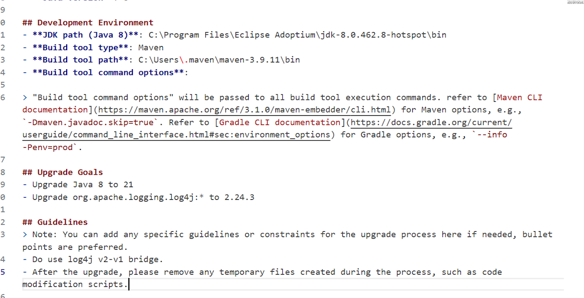 Java のアップグレード シナリオでは、多くの場合、標準の JDK またはフレームワークのアップグレードを超えたカスタマイズが必要になります。たとえば、プロジェクト固有のコード変更を適用したり、ツールが自動的に検出しない内部ライブラリを更新したりします。 これらのニーズをサポートするために、GitHub Copilot の最新化により、アップグレード 計画内でのカスタマイズが可能になりました。 この機能を使用すると、アップグレード プロセスをガイドする独自のレシピ、手順、入力を提供できます。 このカスタマイズは、 アップグレードの目標 と ガイドライン のセクションを変更することで実行できます。