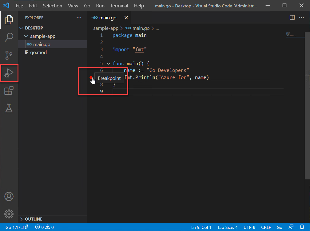 このクイック スタートでは、Go コンパイラとツールをインストールし、Visual Studio Code をインストールして Go コードを記述し、Go の作成中にサポートを提供する Go for Visual Studio Code 拡張機能をインストールします。 構成したら、アプリケーションを作成して実行し、デバッグ ツールを使用して実行を一時停止し、変数の値を観察します。