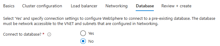 または、[はい] を選択して、データベースに接続するために必要な詳細を指定することもできます。 データベースへの接続の詳細については、「チュートリアル: 高可用性と障害復旧を使用して WebSphere Application Server を Azure Virtual Machines に移行する」を参照してください。