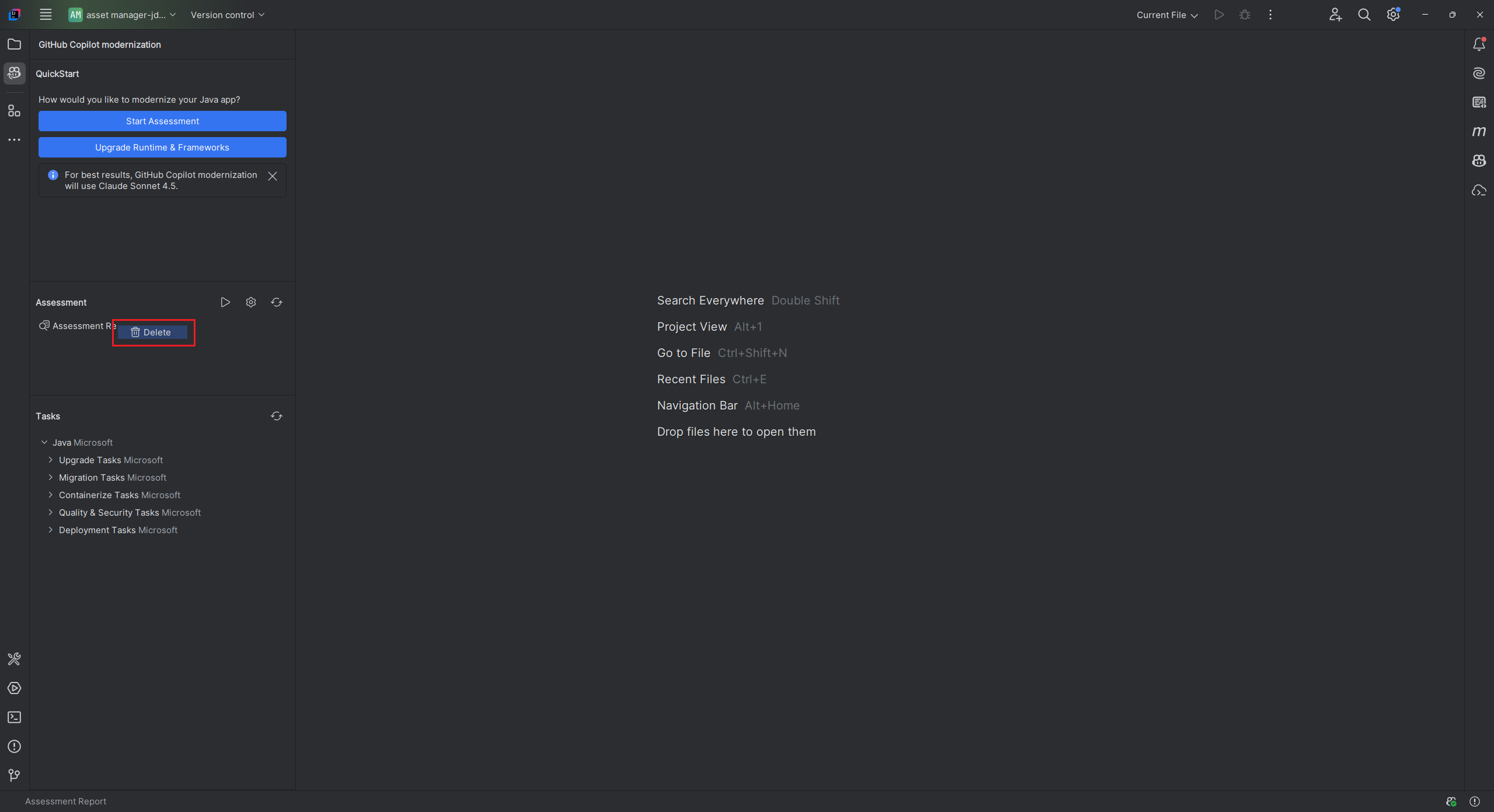 - GitHub Copilot モダン化ウィンドウの QUICKSTART セクションで、[評価の開始] または [評価ダッシュボードを開く] を選択します。