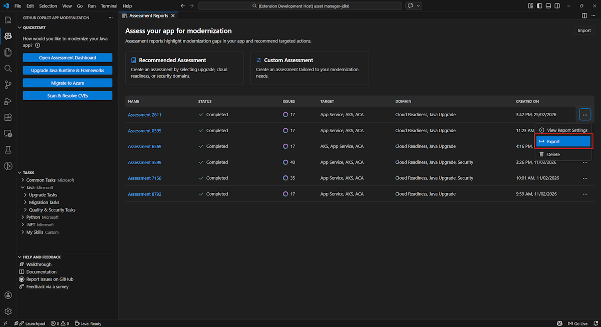 GitHub Copilot モダン化から評価レポートをエクスポートするには、レポート一覧でターゲット レポートの [... (その他のアクション)] ボタンを選択し、[エクスポート] を選択 します。