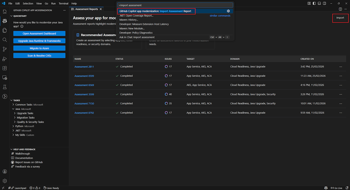 評価レポートを GitHub Copilot モダン化にインポートするには、評価レポート ページで [インポート] を選択するか、Ctrl+Shift+Pキーを押して、インポート評価レポートを検索します。