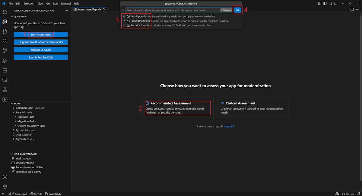 推奨される評価は、手動構成なしで評価を開始するための合理化された方法を提供します。 このアプローチは、一般的な移行シナリオに対するアプリケーションの準備状況をすばやく評価する場合に最適です。