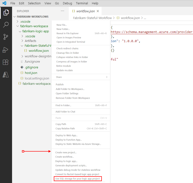3. [エクスプローラー] ウィンドウのロジック アプリ プロジェクトのルートで、プロジェクトのファイルとフォルダーの下にある空白領域の上にマウス ポインターを移動し、ショートカット メニューを開き、[ ロジック アプリ プロジェクトに SQL ストレージを使用する] を選択します。