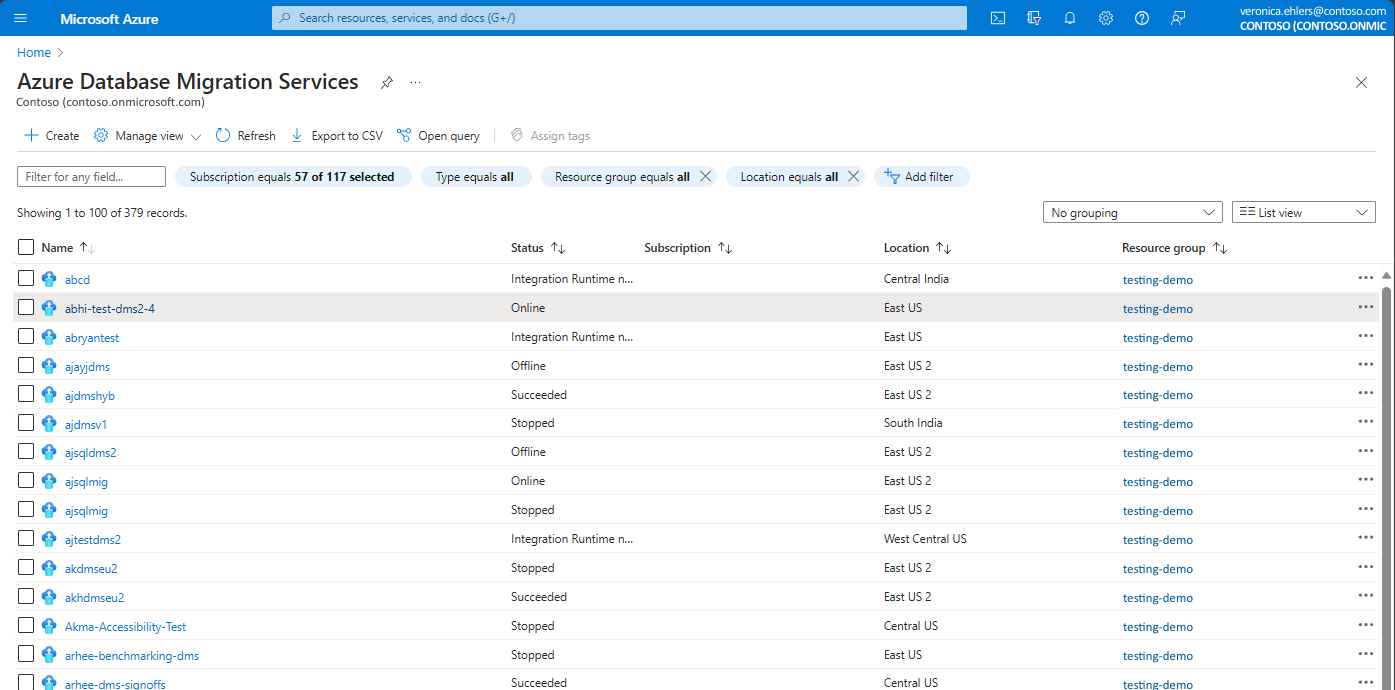Azure portal の [Azure Database Migration Services] で、使用する Database Migration Service の既存のインスタンスを選び、それが適切なリソース グループとリージョンに存在することを確認します。