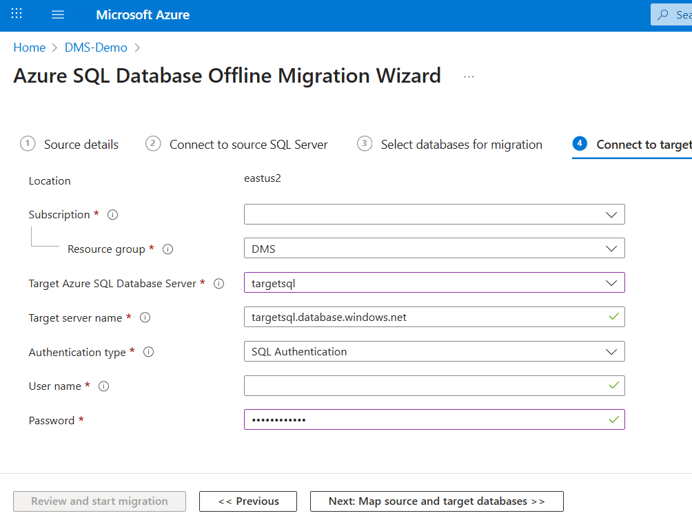 [ ターゲットの Azure SQL Database への接続 ] タブで、接続の詳細を指定し、[ 次へ: ソース データベースとターゲット データベースをマップする] を選択します。