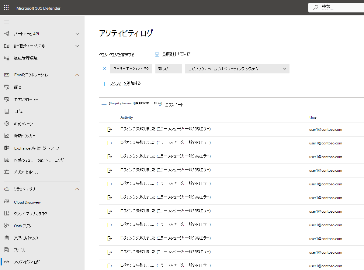 たとえば、アクティビティ ログを使用して、オペレーティング システムまたはブラウザーを使用しているユーザーをorganizationで検索できます。次のように、アプリを [アクティビティ ログ] ページでDefender for Cloud Appsに接続した後、詳細フィルターを使用し、[ユーザー エージェント タグ] を選択します。 次に、[ 古いブラウザー ] または [ 古いオペレーティング システム] を選択します。