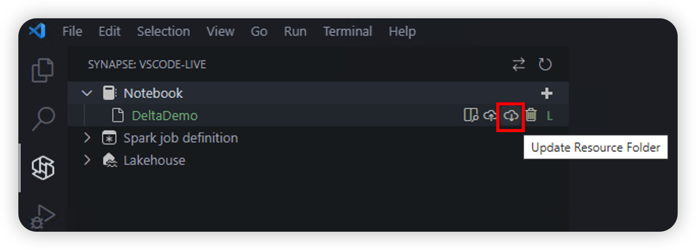 リモート ワークスペースからノートブック リソースをダウンロードするには、[ リソース フォルダーの更新 ] オプションを選択します。 ダウンロード プロセスでは、 組み込み フォルダーの下にあるすべてのファイルとサブフォルダーがローカル ノートブック フォルダーにダウンロードされます。 ダウンロード プロセスによって、リソース ファイルのローカル バージョンが上書きされます。 リモート ワークスペースに存在しなくなったファイルについては、ダウンロード プロセスによって元の親フォルダーの下にある _backup サブフォルダーに移動されます。