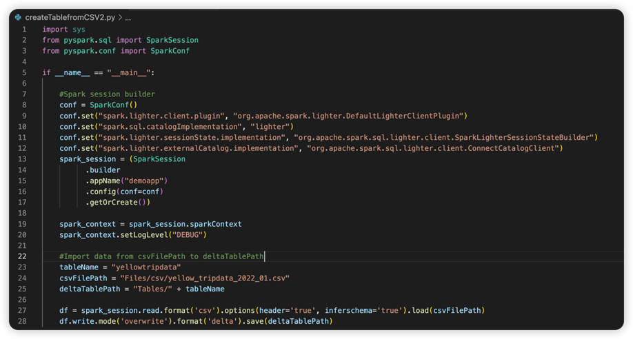 sparkconf.py という名前のファイルには、SparkConf オブジェクトを設定するために追加する必要があるコード スニペットが含まれています。 リモート デバッグを有効にするには、SparkConf オブジェクトが正しく設定されている必要があります。 次の図は、ソース コードの元のバージョンを示しています。