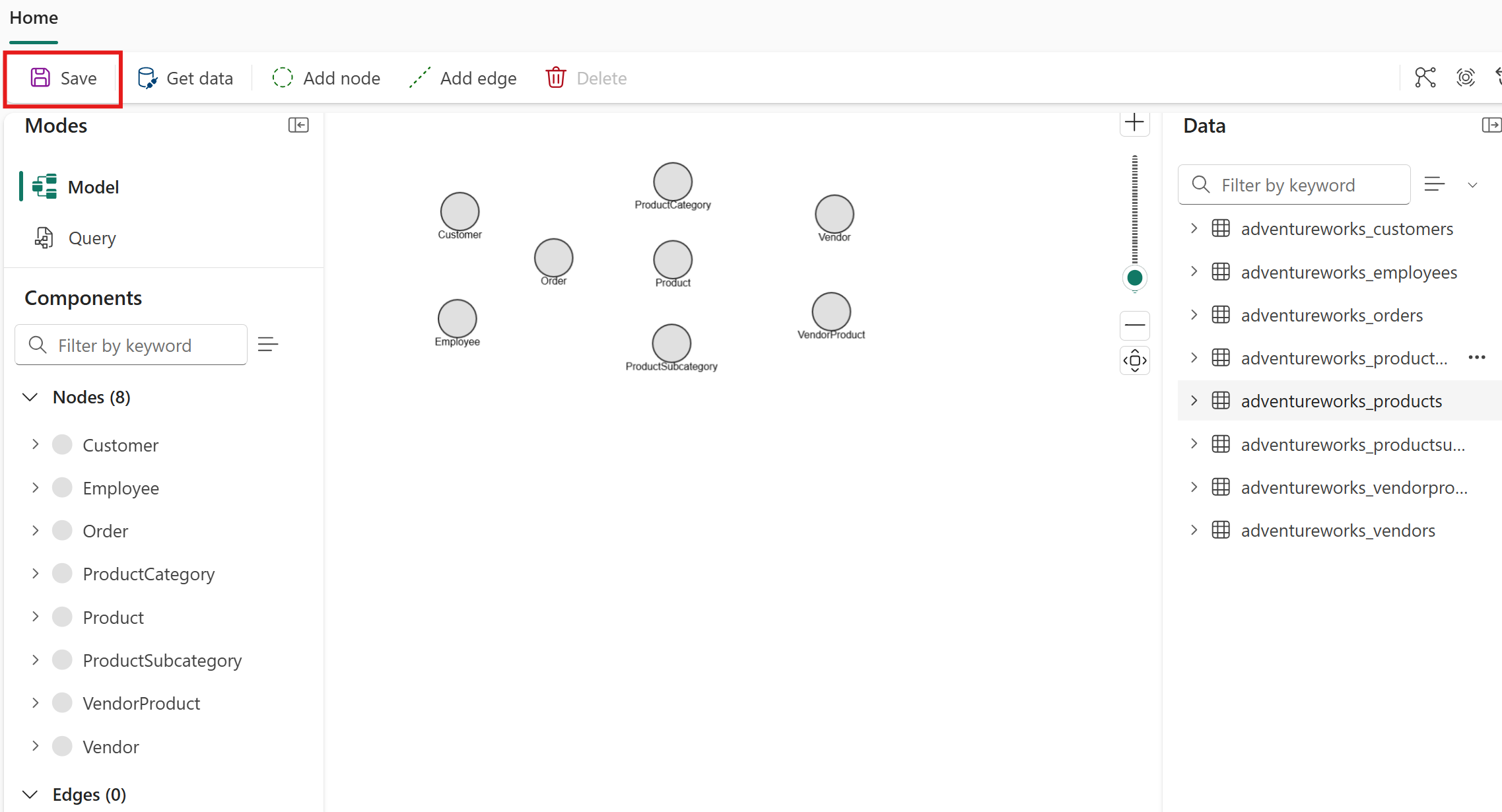 このチュートリアルの手順では、グラフ モデルにノードの種類を追加します。 ノードは、顧客、製品、注文などのデータ内のエンティティを表します。 後で、これらのノードをエッジに接続して、それらの間のリレーションシップを定義します。