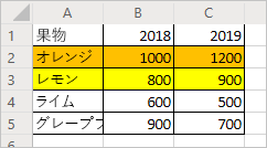 セル A2:C2 ("オレンジ" 行) を選択し、塗りつぶしの色をオレンジ色に設定します。