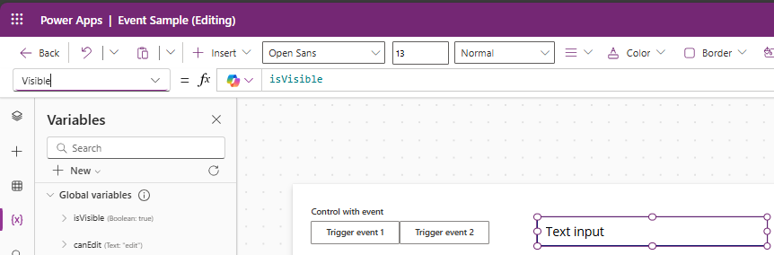isVisible変数とcanEdit変数を更新します。イベント Power FX 式 customEvent1 If(isVisible, Set (isVisible, false), Set (isVisible, true))customEvent2 If(canEdit = DisplayMode.Edit, Set(canEdit, DisplayMode.Disabled), Set (canEdit, DisplayMode.Edit))