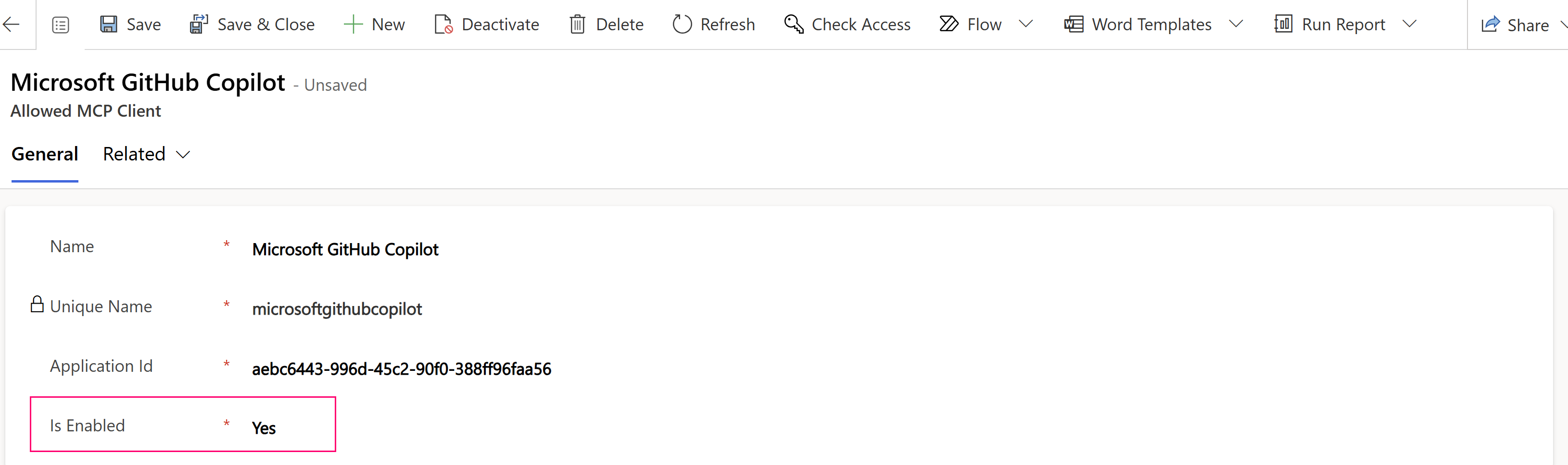 既定では、Copilot Studio で Dataverse MCP サーバーとの相互作用を許可する MCP クライアント が有効になっています。 管理者は、設定をクリアすることで、Dataverse の MCP を無効にすることができます。