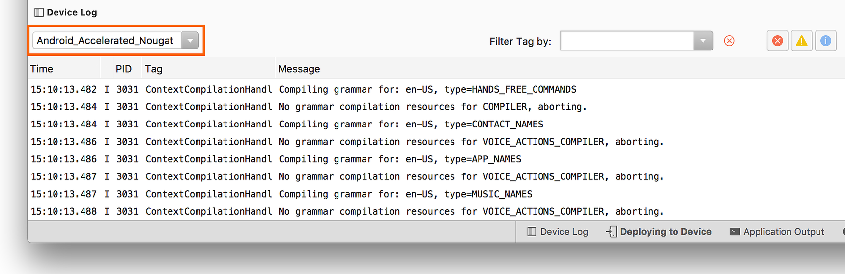 デバイス ログ ツールを開くには、ツール バーの [デバイス ログ (logcat)] アイコンをクリックします。