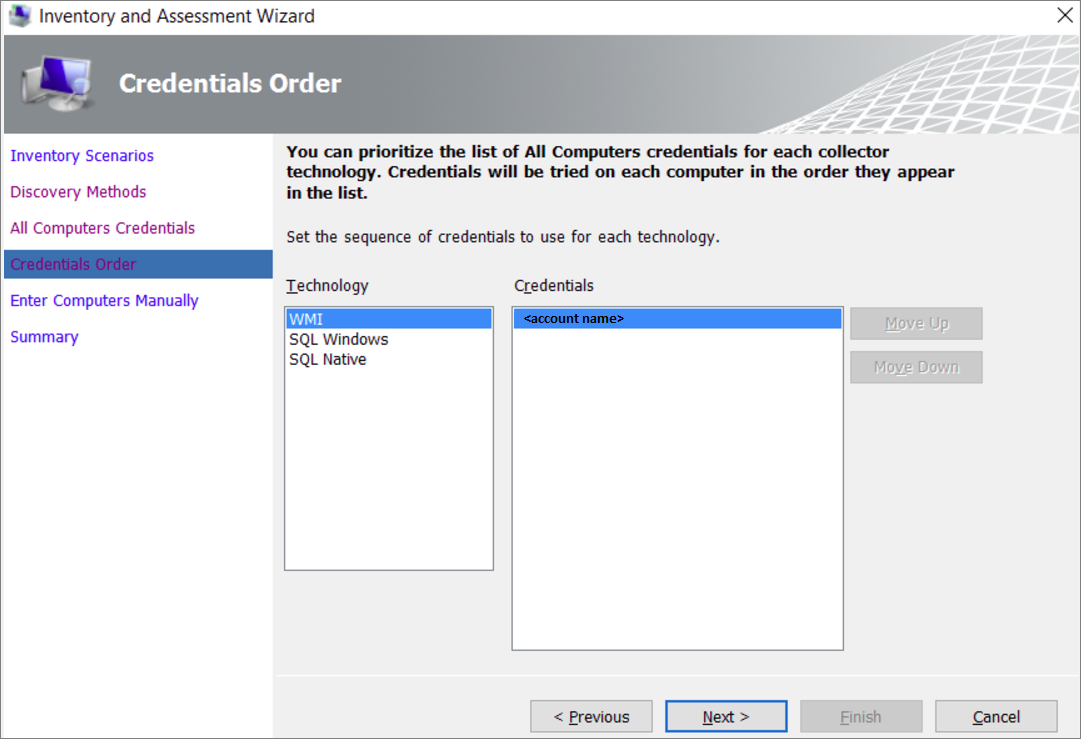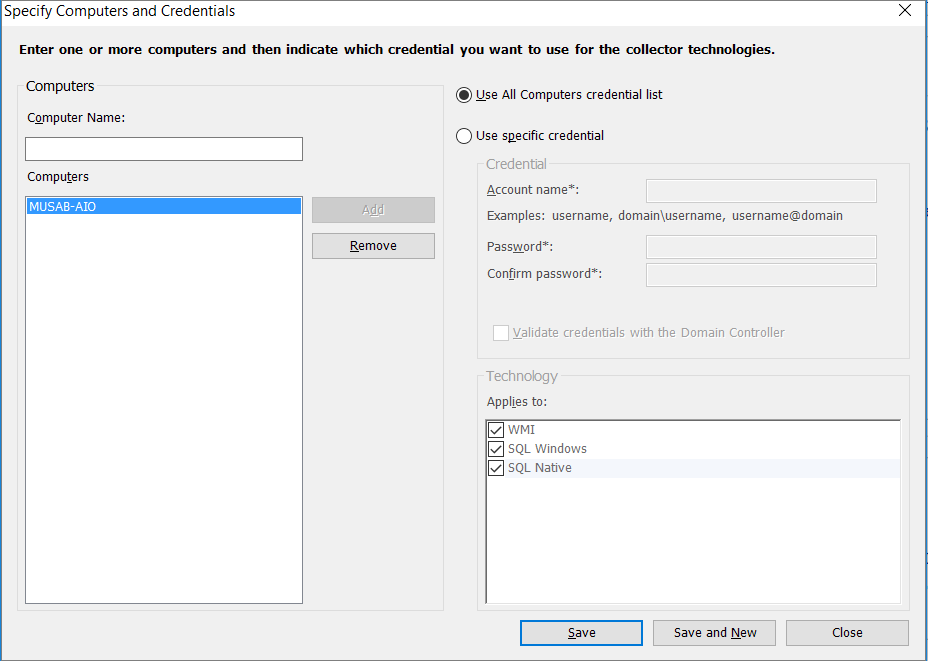 検出する各コンピューターの資格情報を指定します。 コンピューターまたはマシンごとに一意の資格情報を使用するか、 [コンピューター] 一覧から選択できます。