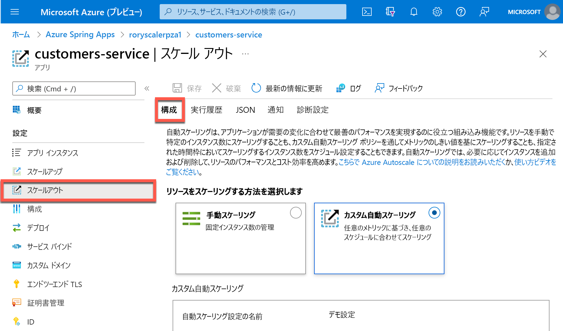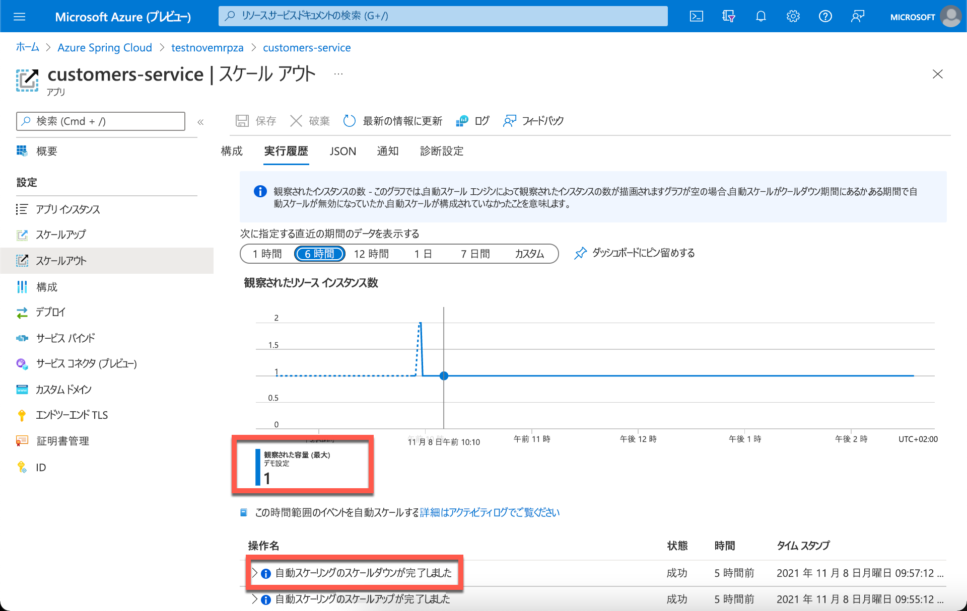 サンプルの Azure Spring Apps アプリケーションでは、アプリケーションを作成したときに、顧客サービス マイクロサービスでスケールアウト アクションがトリガーされています。