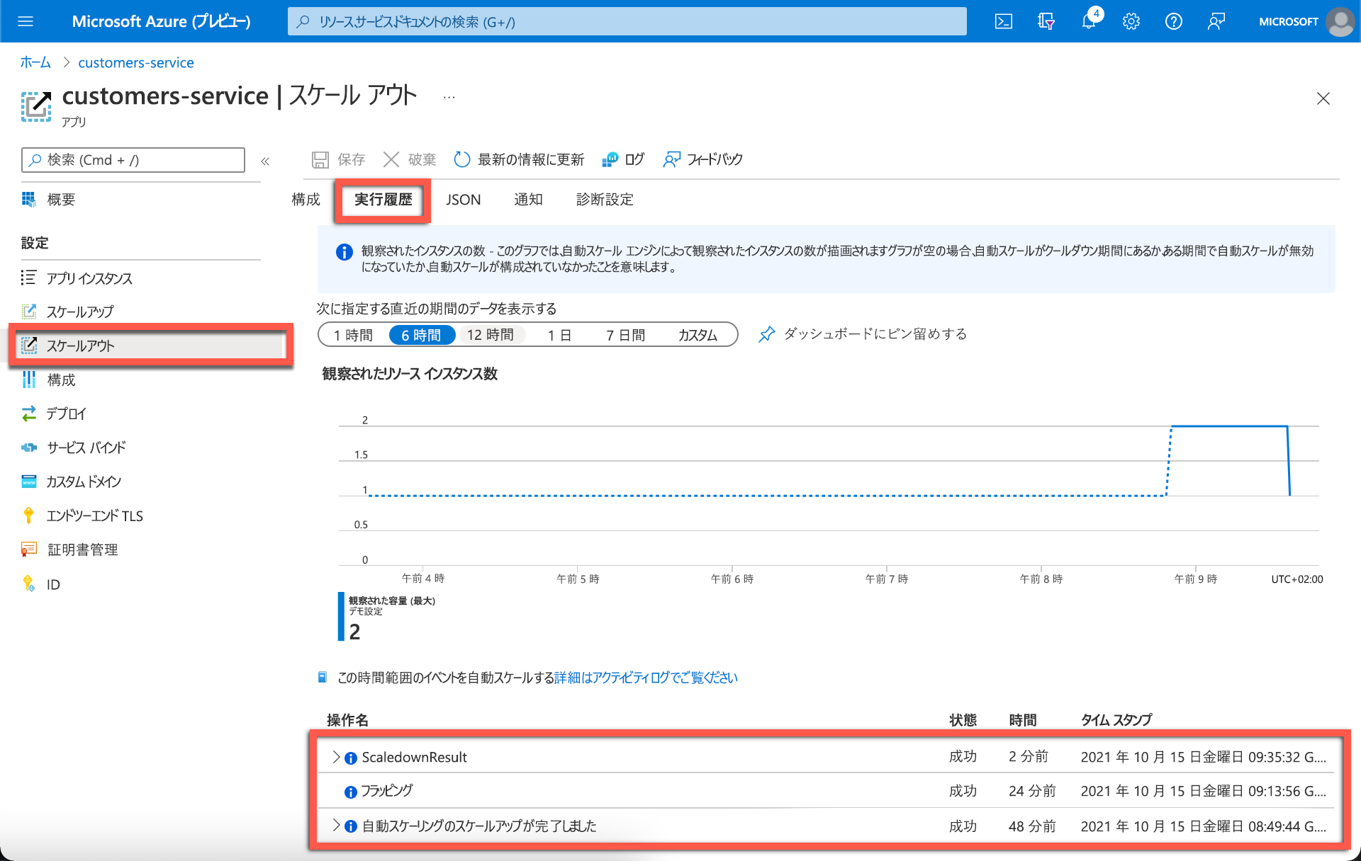 元のブラウザー ウィンドウに戻り、自動スケール設定で [ 実行履歴 ] タブを選択します。