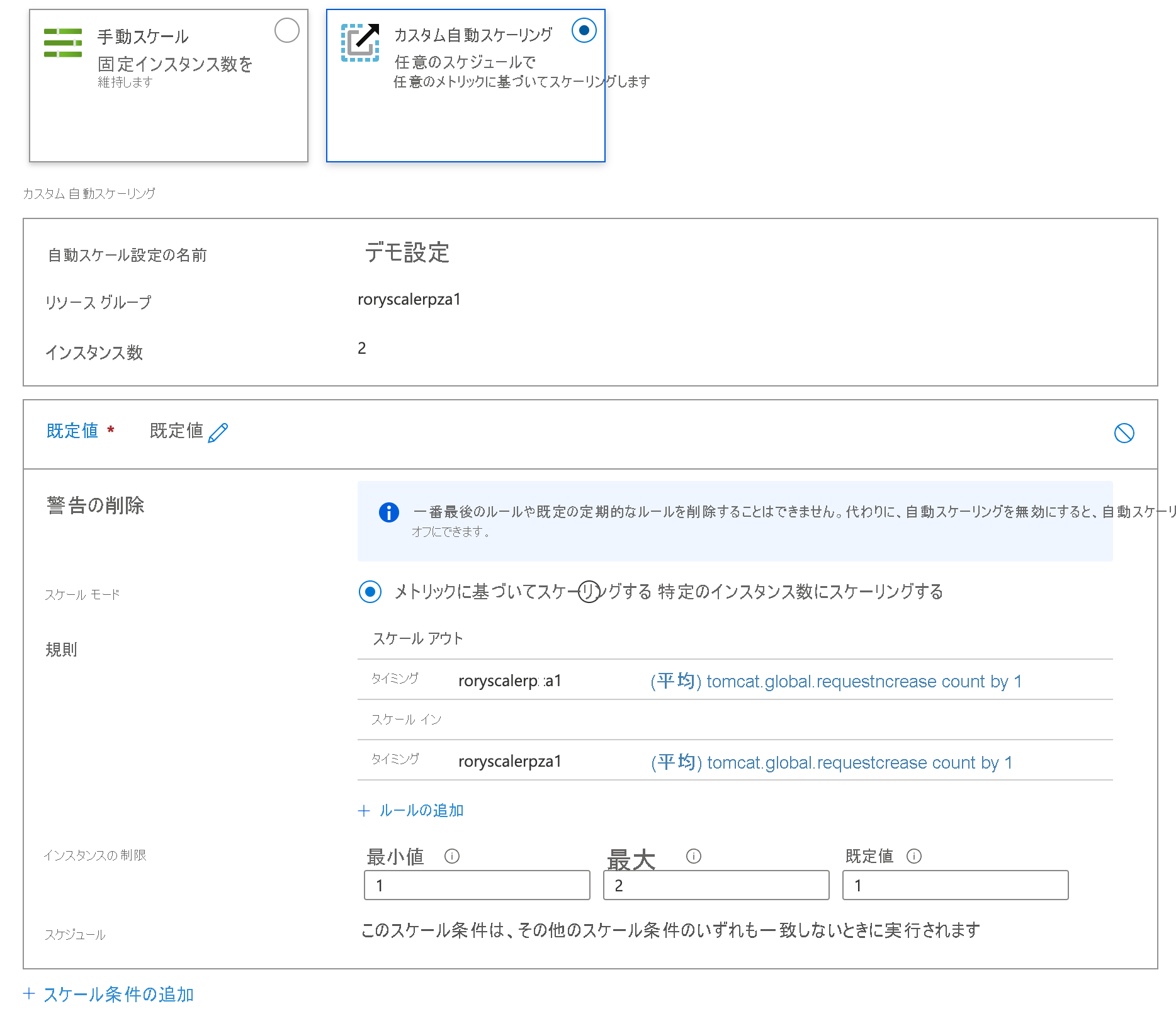 Azure portal で、アプリケーションの事前設定構成を表示します。 次の図は、Tomcat 要求数に合わせてスケーリングするように構成された カスタム 自動スケールを示しています。
