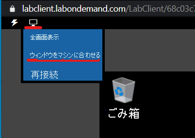 ラボ環境をドッキングしてウィンドウいっぱいに表示されるようにするには、上部にある PC アイコンを選択してから、マシンにウィンドウを合わせて表示 を選択します。