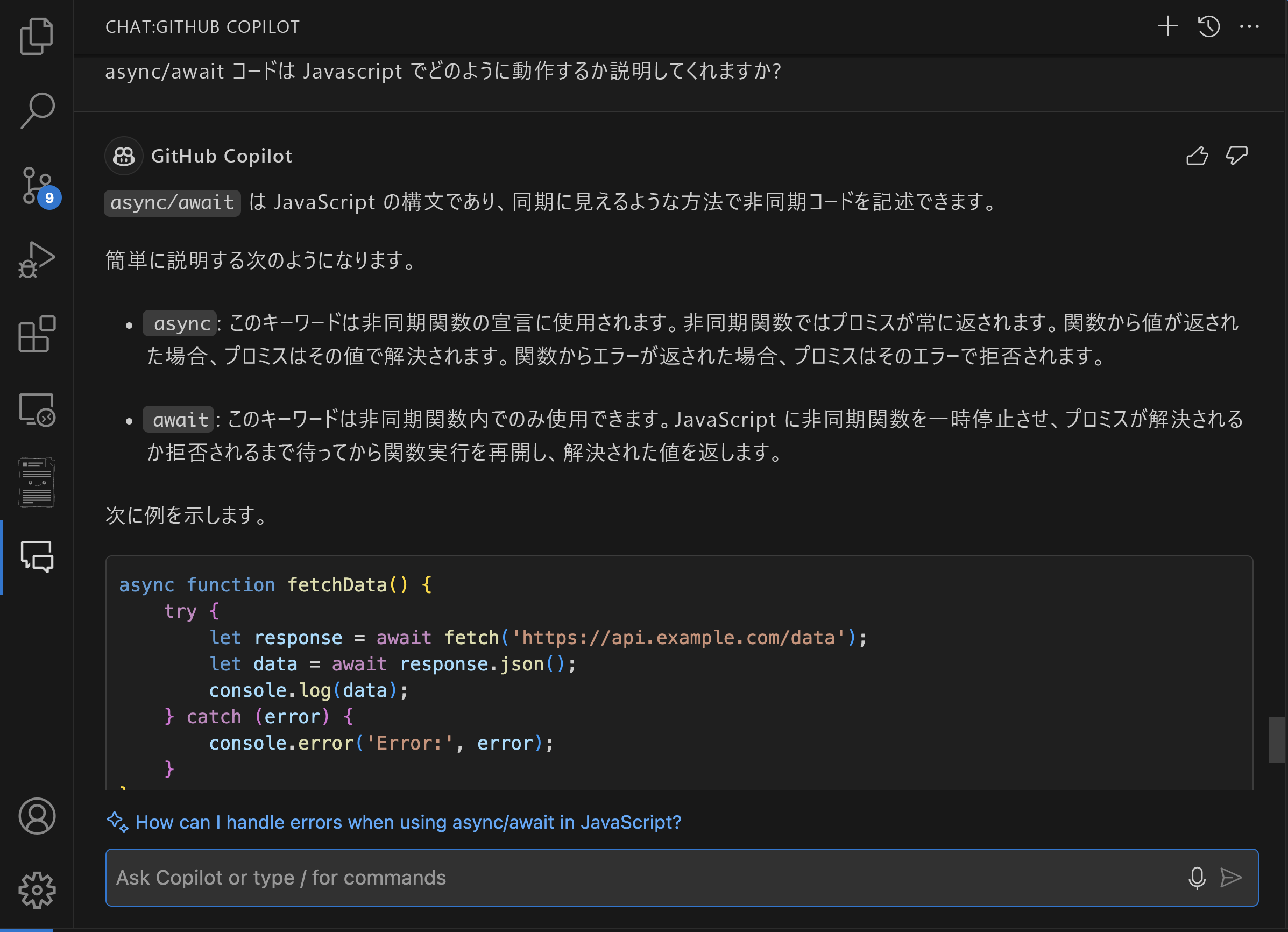 Code の説明 Copilot Chat を使用して、複雑なコード スニペットをより深く理解することもできます。 コードを簡単な用語に分割し、未知のコードの目的と機能を説明し、ベスト プラクティスと潜在的な最適化に関する分析情報を提供できます。 たとえば、「Python でこの async/await コードがどのように機能するか説明してもらえますか?」と質問できます。