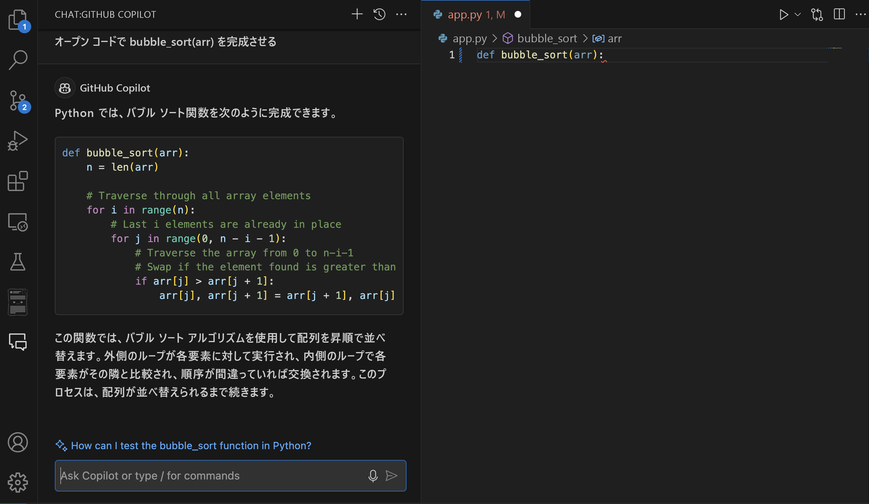複雑なコード生成 複雑なアルゴリズムやデータ構造を実装する必要がある場合、または特定の設計パターンの定型コードを生成する必要がある場合に、Copilot Chat はプロセスの効率化に役立ちます。 複雑な正規表現の作成、詳細な SQL クエリの構築、Python でのバブル並べ替えなどの高度なデータ構造の開発に役立ちます。