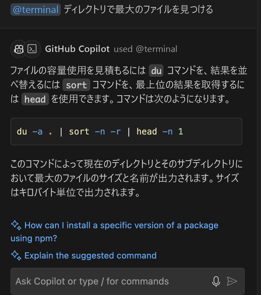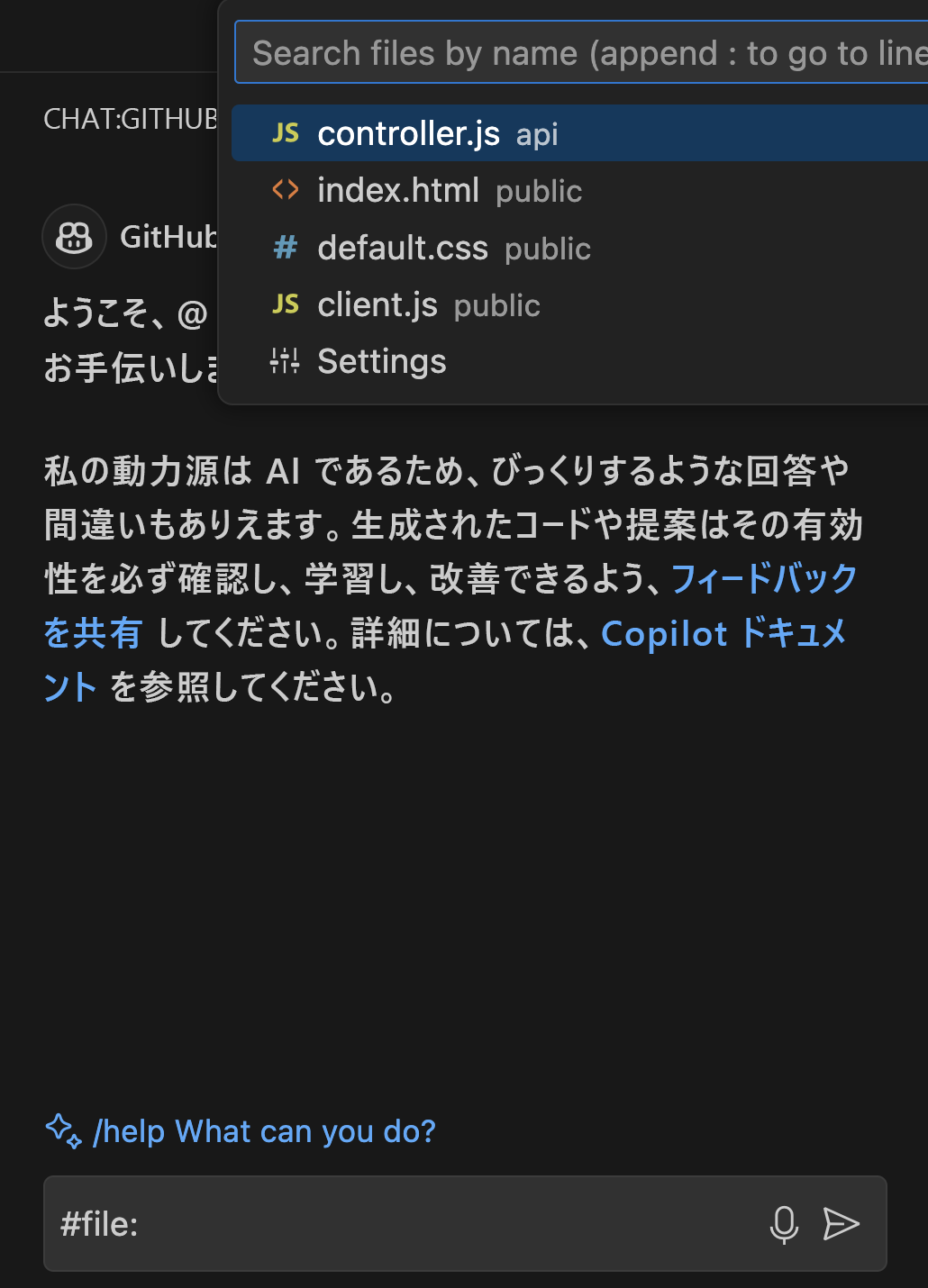 controller.jsという名前のファイルを操作している場合は、#file コマンドを使用して選択し、#file:controller.jsとして質問内で直接参照できます。 この機能は、応答を生成するときに、そのファイルの内容に焦点を当てるように Copilot Chat に指示します。環境リファレンス: コマンド出力に基づいて、ターミナルと共に Copilot チャットを使用してヘルプを取得できます。 これにより、Copilot はデバッグを支援し、ターミナルで何が起こっているかに基づいて提案を提供できます。 たとえば、"@terminalこのエラーを修正するにはどうすればよいですか? では、Copilot がターミナル出力を分析し、関連するソリューションを提案できます。