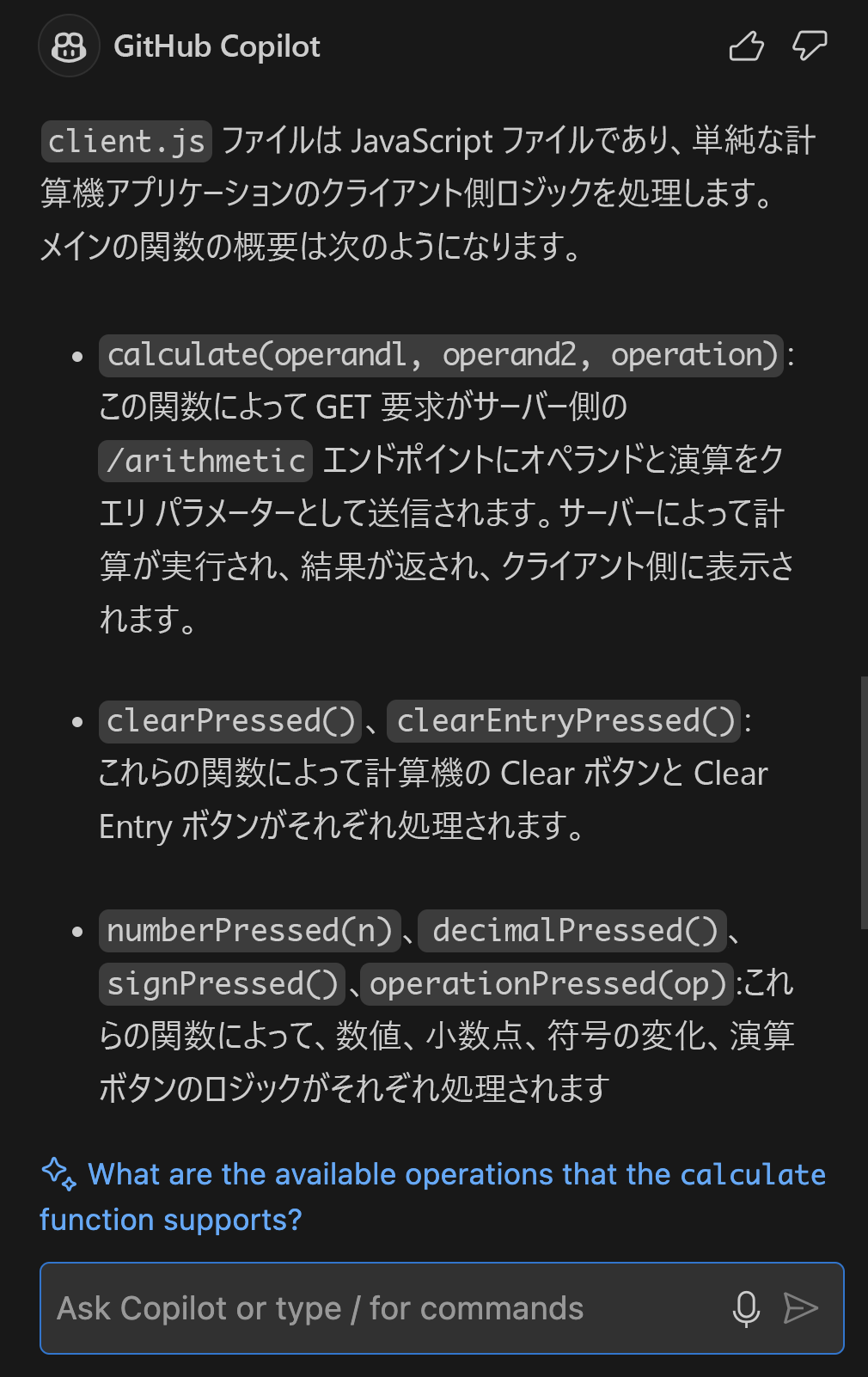 /docを入力し、その後に文書化するコードを入力すると、Copilot によって適切なコメントが生成されます。/explain:選択したコードの説明を提供します。 このコマンドは、特定のコードの動作を理解する必要がある場合に便利です。 たとえば、