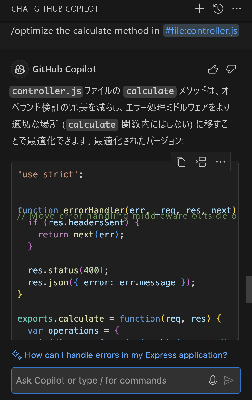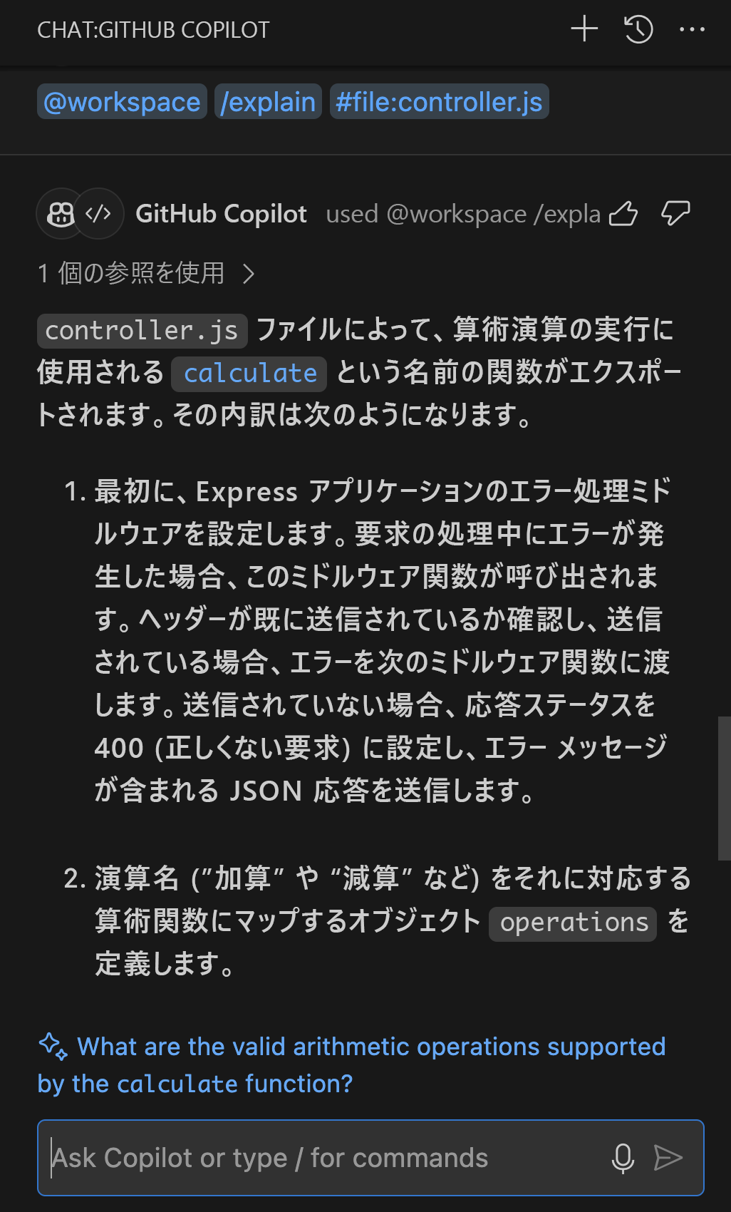 /explain the #file:controller.jsは、そのファイルの詳細な説明を提供します。/fix:選択したコードの問題の修正を提案します。 問題が発生している場合は、問題のあるセクションをハイライトし、