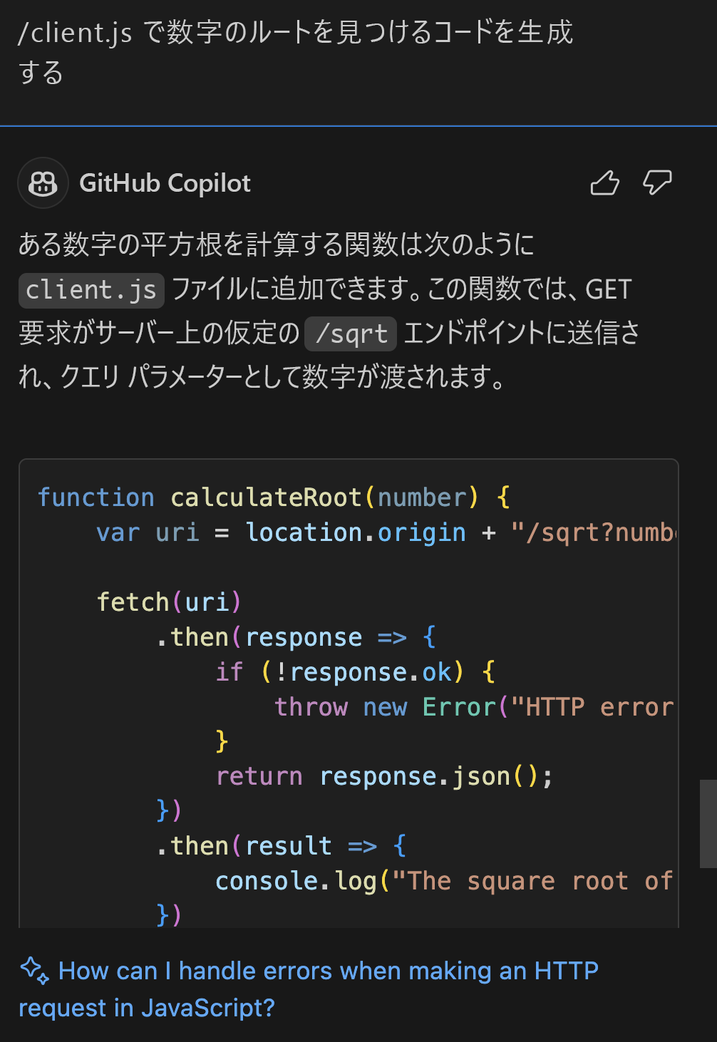 /fixを使用して問題を解決するための提案を受け取ることができます。/generate:要件に基づいて新しいコードを生成するのに役立ちます。 たとえば、