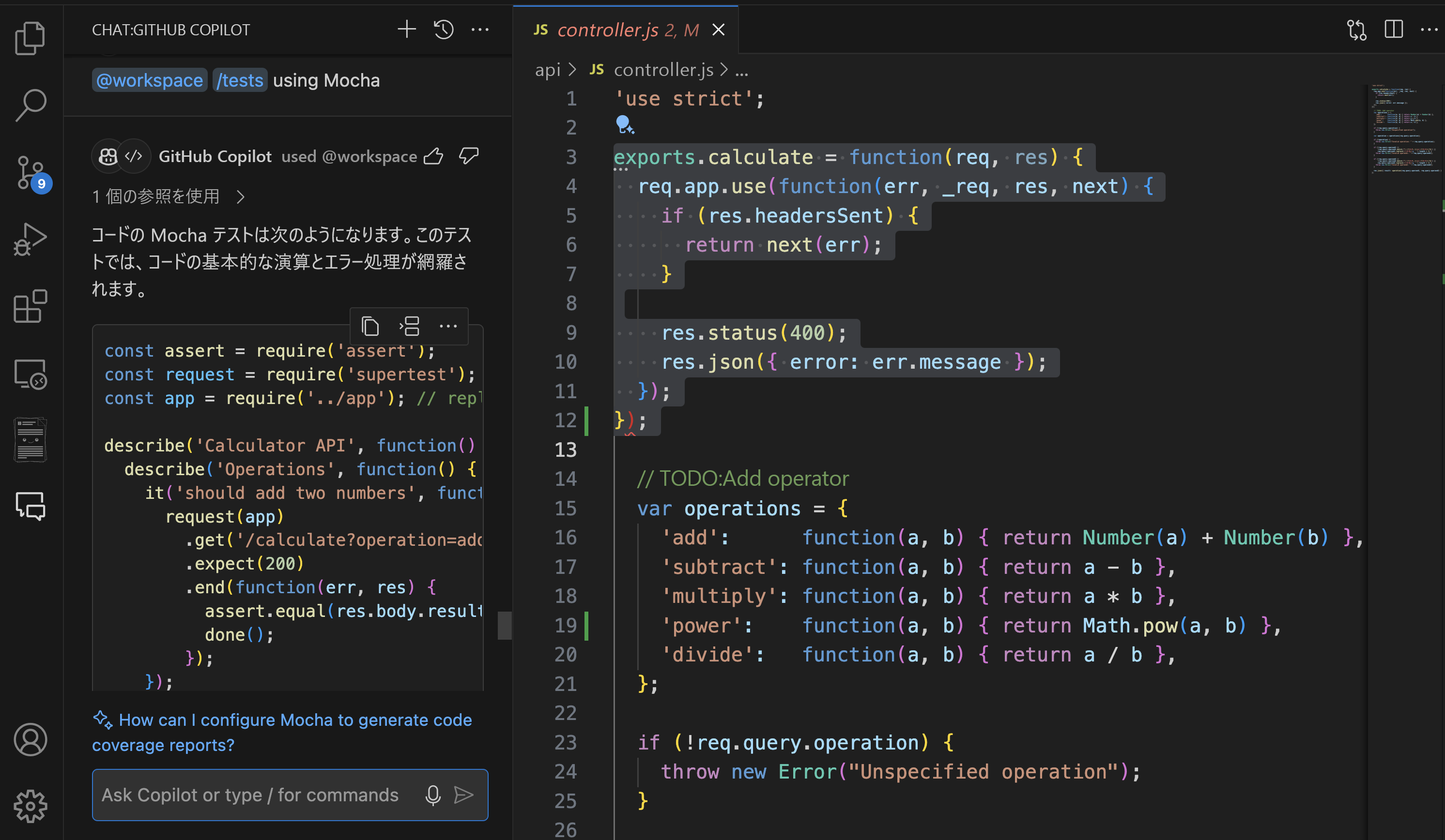 /optimize the計算method in controller.jsでは、その特定のメソッドのパフォーマンスを向上することに重点を置いています。/tests:選択したコードのユニット テストを自動的に作成します。 コードを強調表示するだけで、