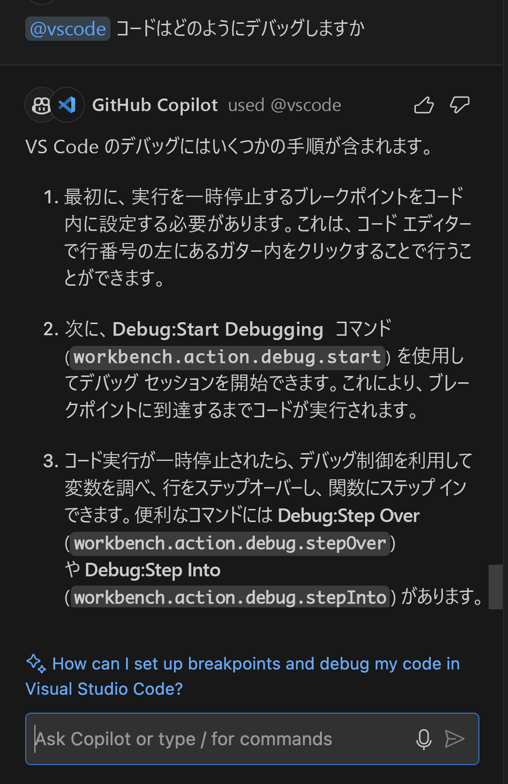 - GitHub Copilot Chat を使用したデバッグ。