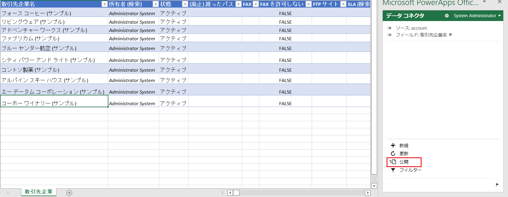 しばらくすると、データがスプレッドシートに表示されます。ここで、アドイン ウィンドウのボタンにより、Excel を使用してデータを追加、更新、または削除できます。 公開ボタン (アドオン パネル内) をクリックすると、変更が保存されます。