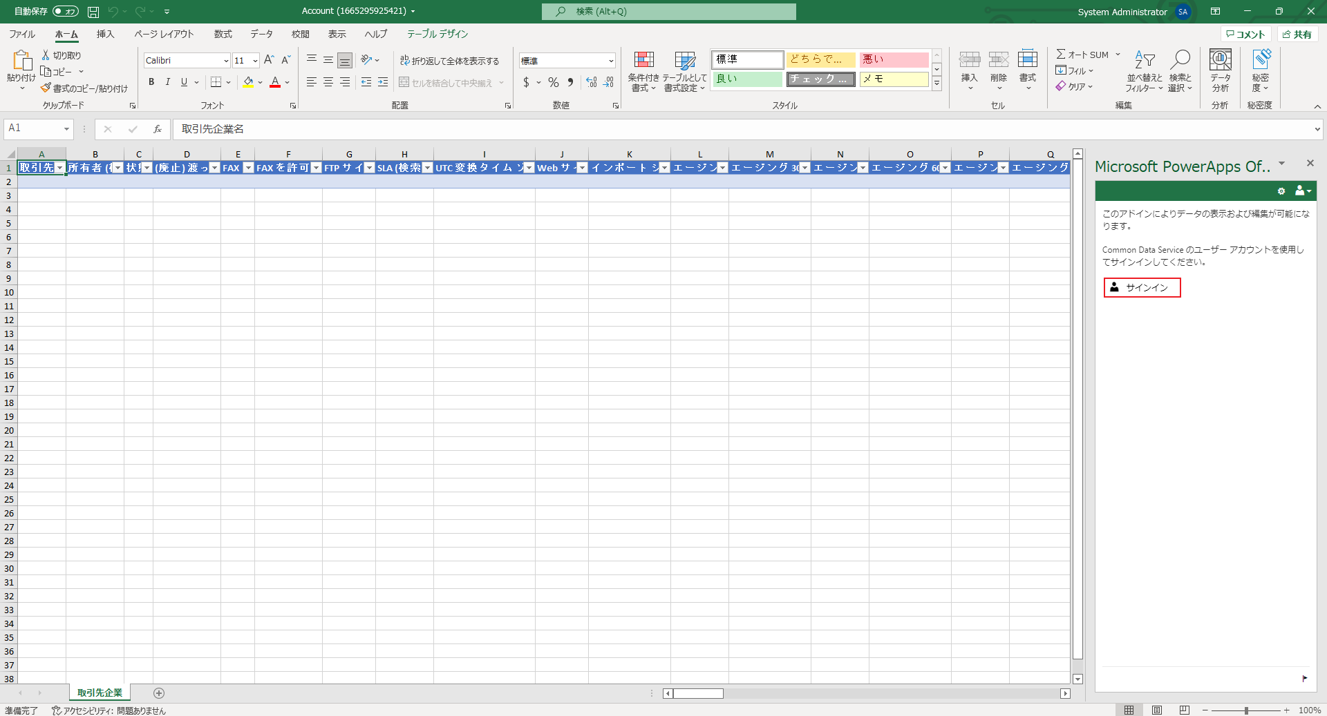 Power Apps はお使いのブラウザーのダウンロードにファイルをダウンロードします。ここから、Excel Online または Excel アプリでファイルを開くことができます。 ファイルを開くと、Microsoft Power Apps Office アドインを有効にするよう、サインインを求めるメッセージが表示されます。 いずれのデータも表示されません。 サインイン を選択します。