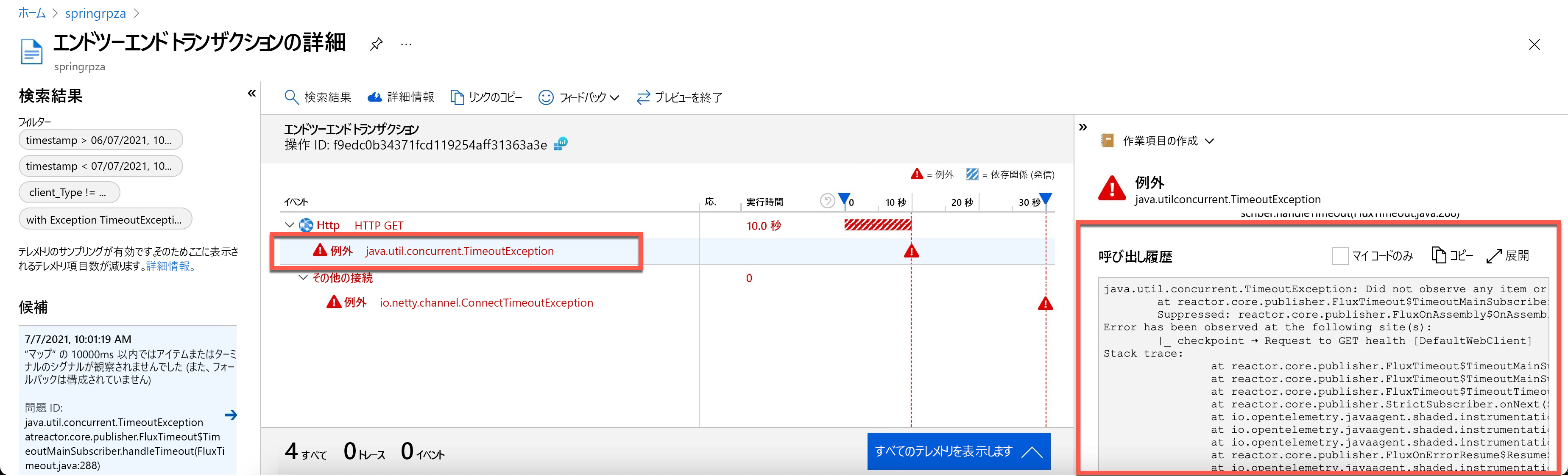最後に、画面の中央にある [エンド ツー エンド トランザクション ] タブで、例外を選択して詳細とスタックトレースを表示します。