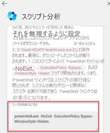 Copilot はスクリプトを分析し、結果をスクリプト分析カードに表示します。 [コードを表示する] を選ぶと、分析に関連する特定のコード行を表示できます。 [コードを非表示にする] を選ぶだけで、コードを非表示にすることができます。