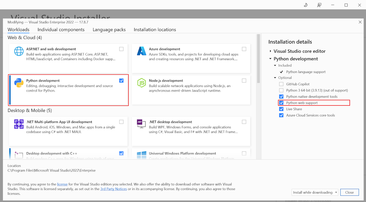 Visual Studio をインストールする必要がある場合は、 Visual Studio のダウンロード に移動して無料でインストールします。 Visual Studio インストーラーで、 Python 開発 ワークロードを選択します。 インストールの詳細ウィンドウで、 Python Web サポートを選択します。
