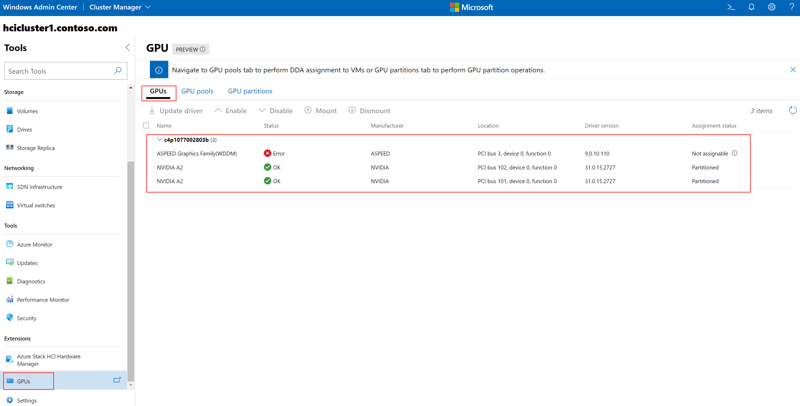 次の手順に従って、Windows Admin Center を使用して GPU ドライバーがインストールされており、パーティション分割可能かどうかを確認します。