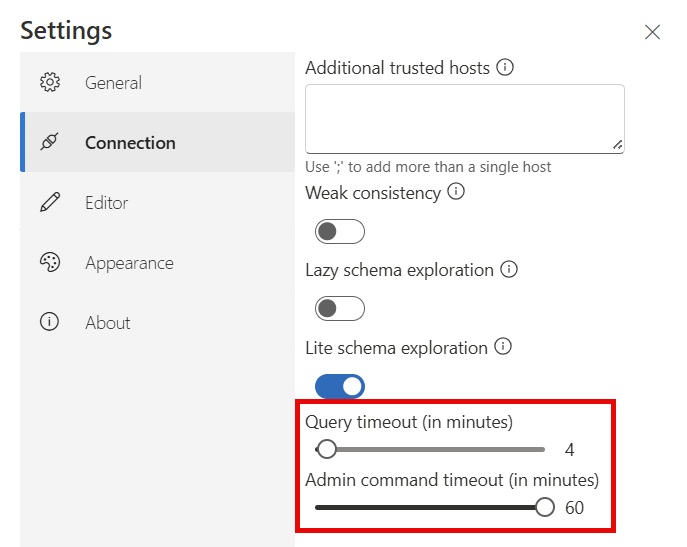 In the Settings > Connection window, adjust the Query timeout or the Admin command timeout.